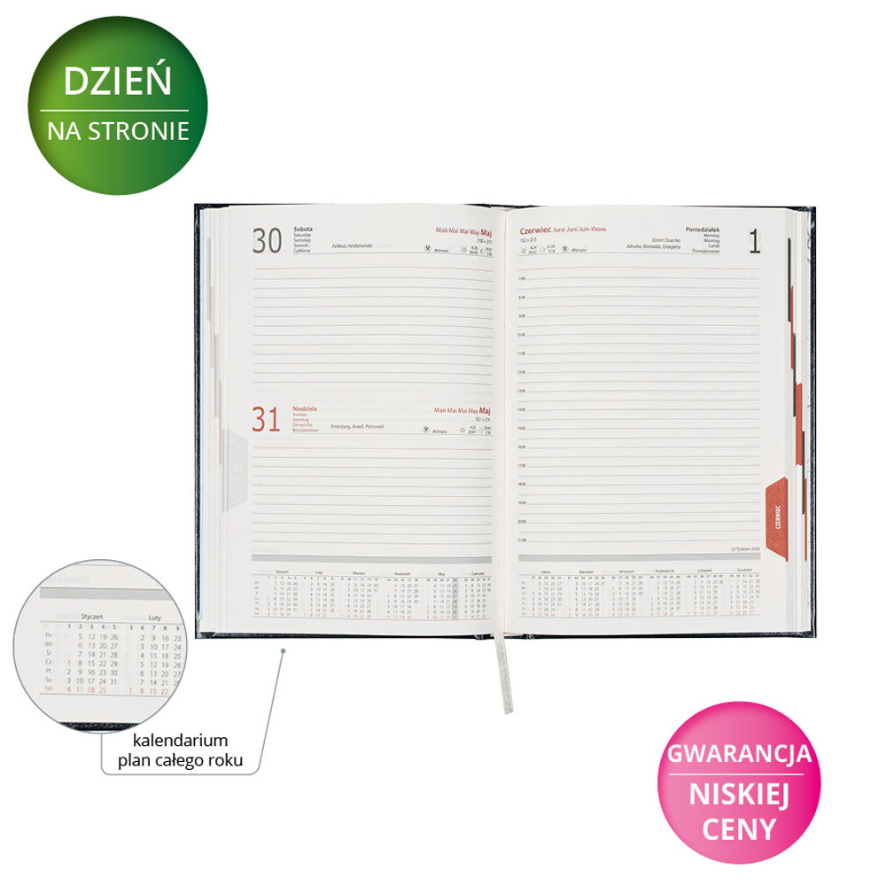 - kalendarium: PL/GB/D/RUS/FR, imieniny i święta, fazy księżyca i zachody słońca, na dole kalendarium plan całego roku
