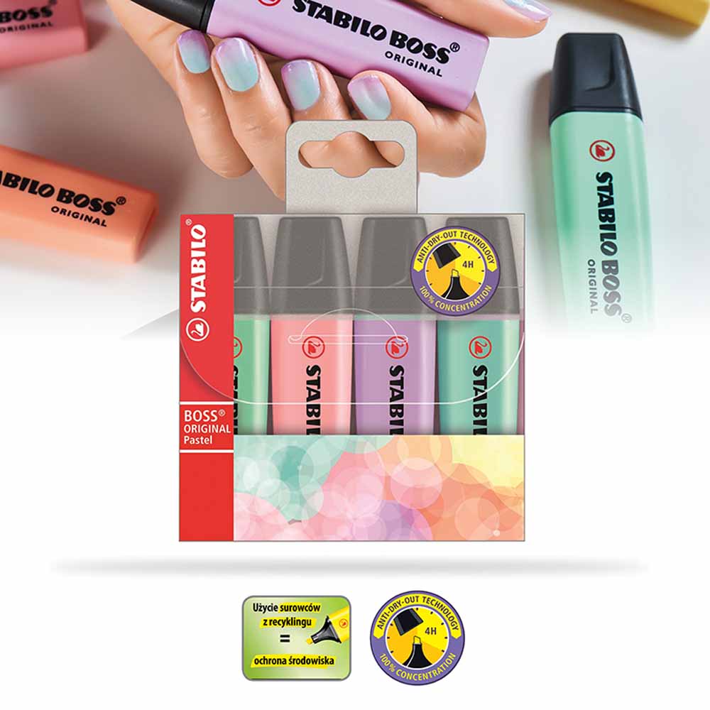 STABILO BOSS ORIGINAL dba o środowisko - wszystkie czarne elementy zakreślacza wykonane są z plastiku pochodzącego z recyklingu. Zakreślacz jest również łatwy do ponownego napełnienia, co redukuje ilość odpadów.