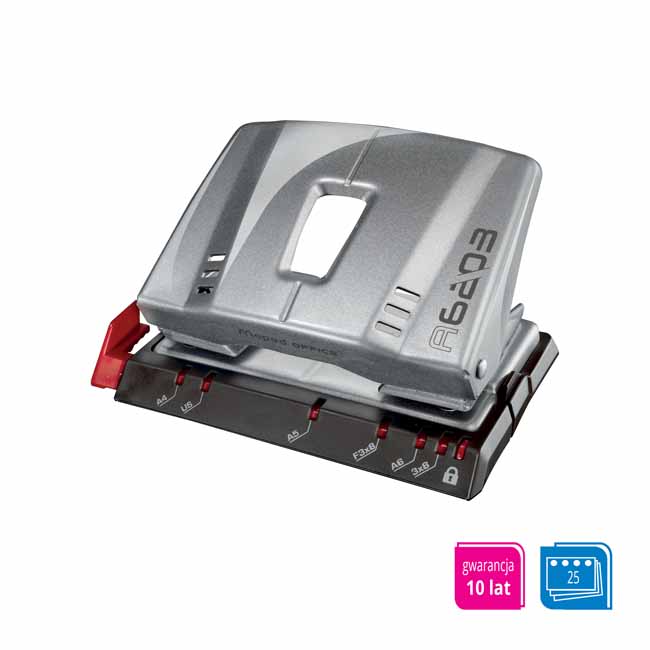 Dzięki podwójnemu wskaźnikowi środka strony i listwie formatowej, dokumenty są zawsze idealnie wyśrodkowane. Dziurkacz wykonuje otwory o średnicy 5,5 mm, z rozstawem 80 mm – to klasyczne parametry, które pasują do większości segregatorów. Dodatkowo, 3-letnia gwarancja daje pewność długotrwałego użytkowania.