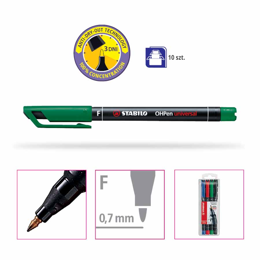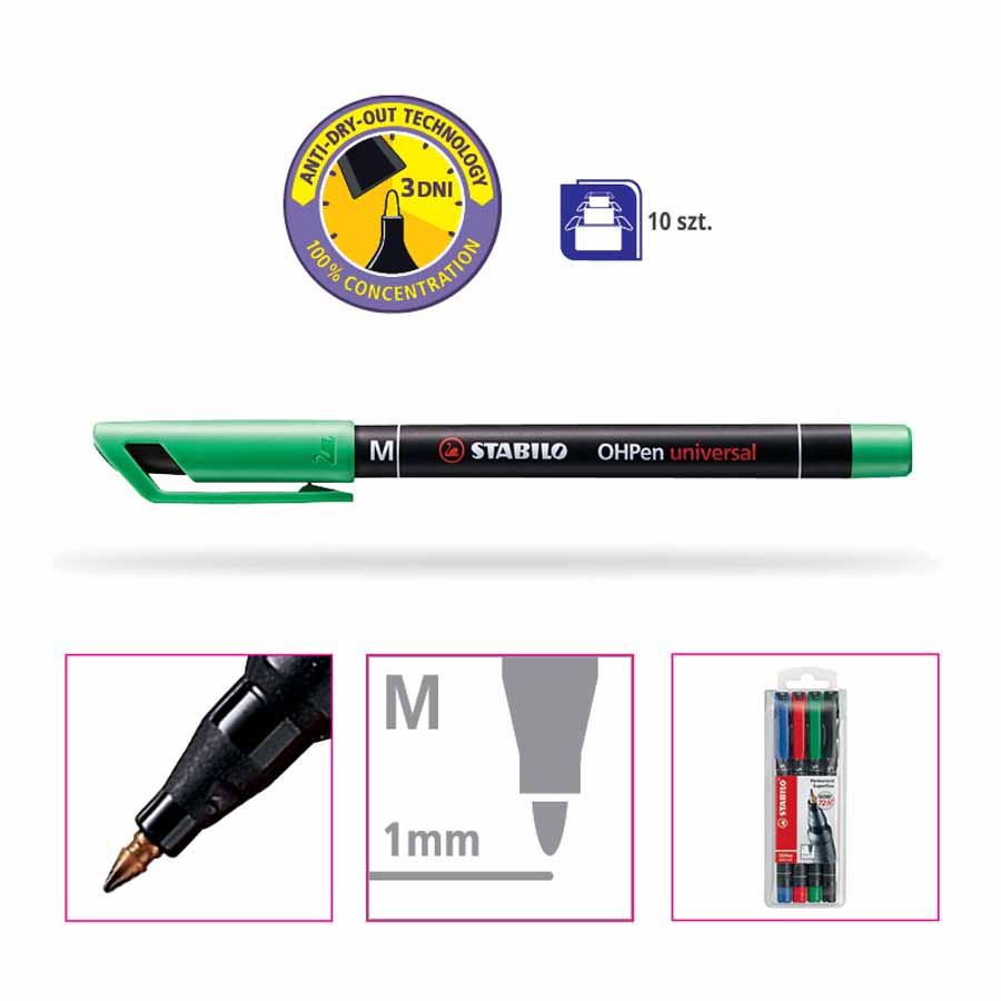 Zestaw foliopisów STABILO OHPen S w kolorach czarnym, czerwonym, zielonym i niebieskim jest niezwykle wszechstronny, idealny do pisania na szkle, torebkach foliowych, etykietach, zdjęciach, błyszczącym papierze, płytach CD oraz zdjęciach rentgenowskich. Ich uniwersalność sprawia, że są niezastąpione w wielu sytuacjach.