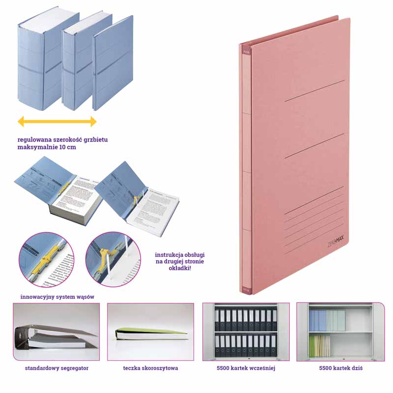 - szerokość teczki zwiększa się wraz z ilością przechowywanych dokumentów, efektem jest znaczna oszczędność przestrzeni
