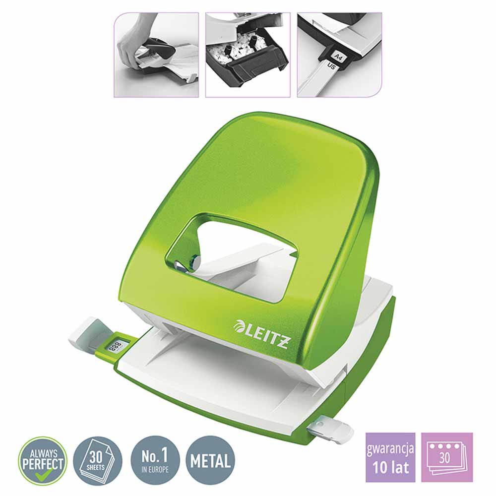 - metalowy dziurkacz biurowy z wykończeniami z tworzywa sztucznego