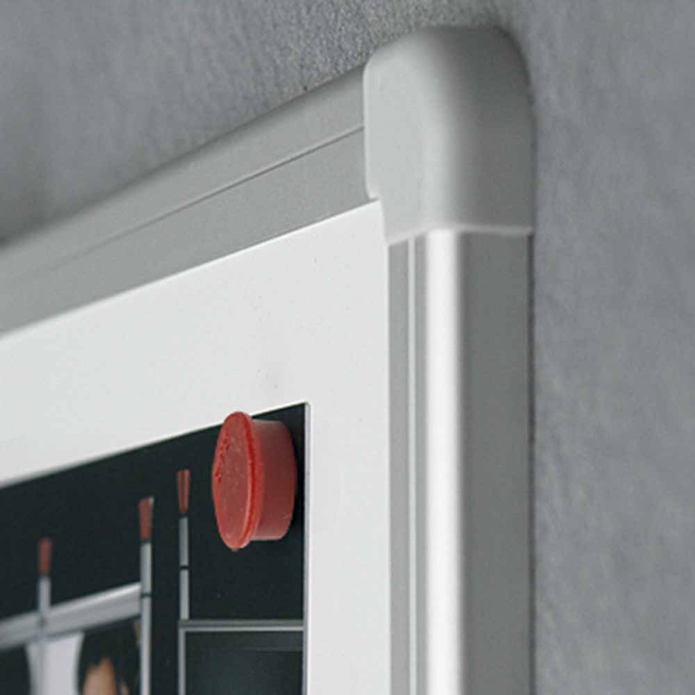 Tablica została osadzona w ramie z profilu aluminiowego w kolorze srebrnym, wykończonej popielatymi narożnikami, które dodają jej elegancji. Tył tablicy wzmocniono blachą ocynkowaną, co zapewnia stabilność, ochronę przed wilgocią oraz zapobiega wyginaniu, gwarantując długą żywotność.